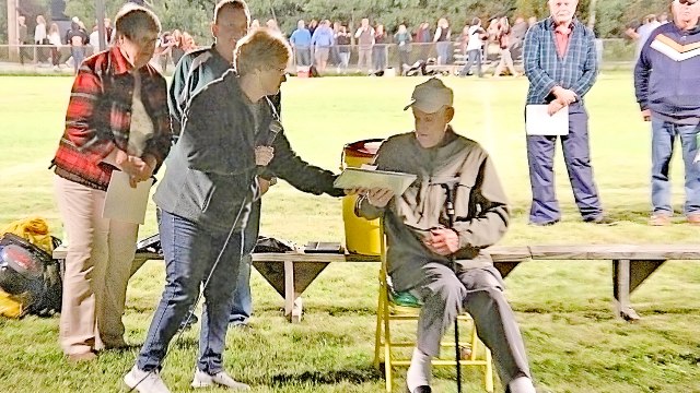 Engadine Consolidated Schools Board of Education member Marge Nelson directed the program. She told of Carlson’s achievements and contributions and read a Sault Evening News article from 1974.
