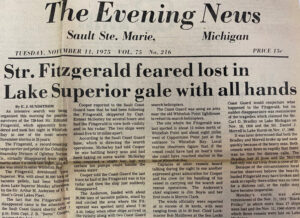 The Tuesday, November 11, 1975, issue of the Sault Evening News headlined, “Str. Fitzgerald feared lost in Lake Superior gale with all hands.”